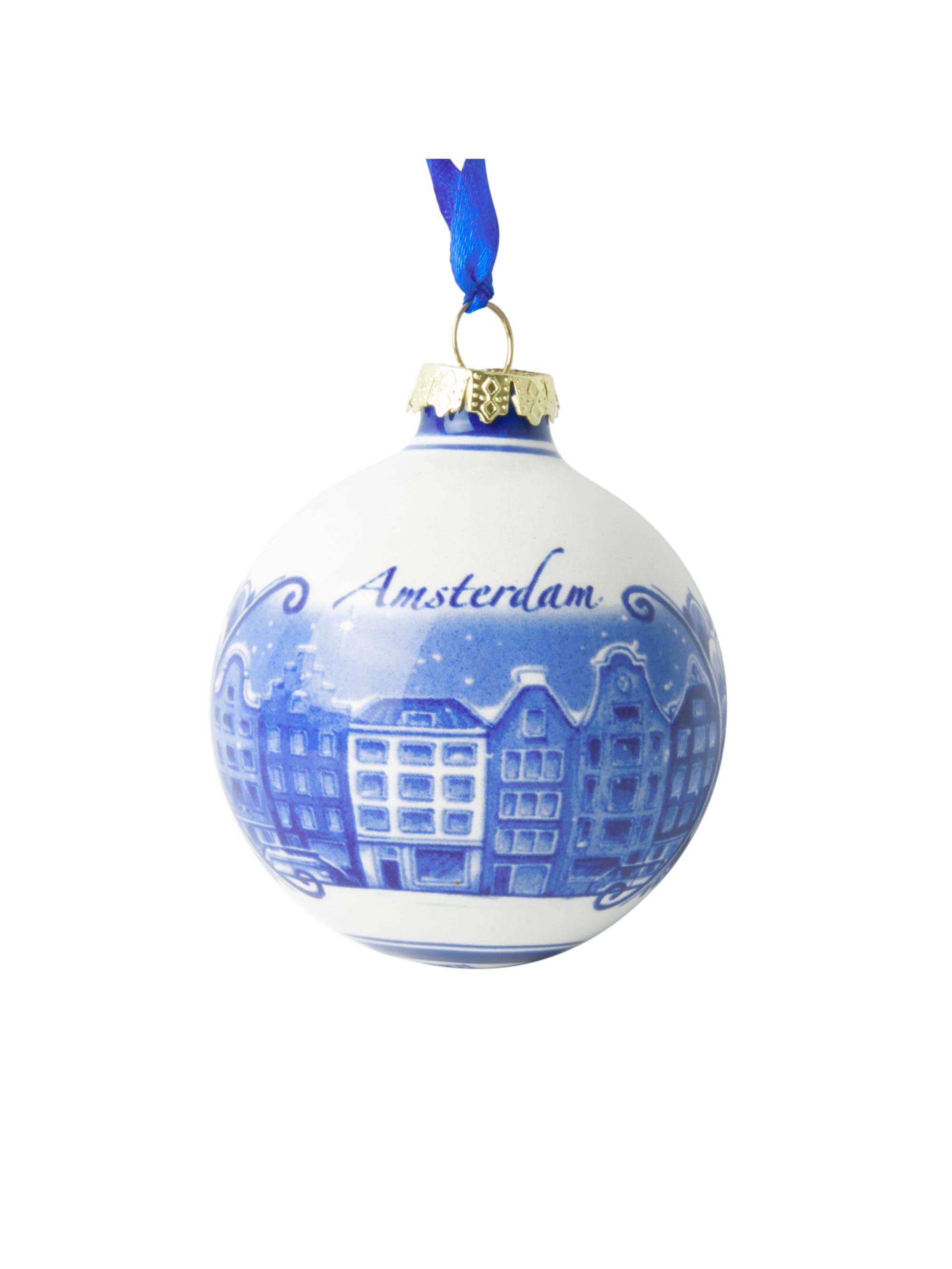Kerstbal Amsterdam - Grachtenpandjes - Delfts blauw - Keramiek - 7 cm