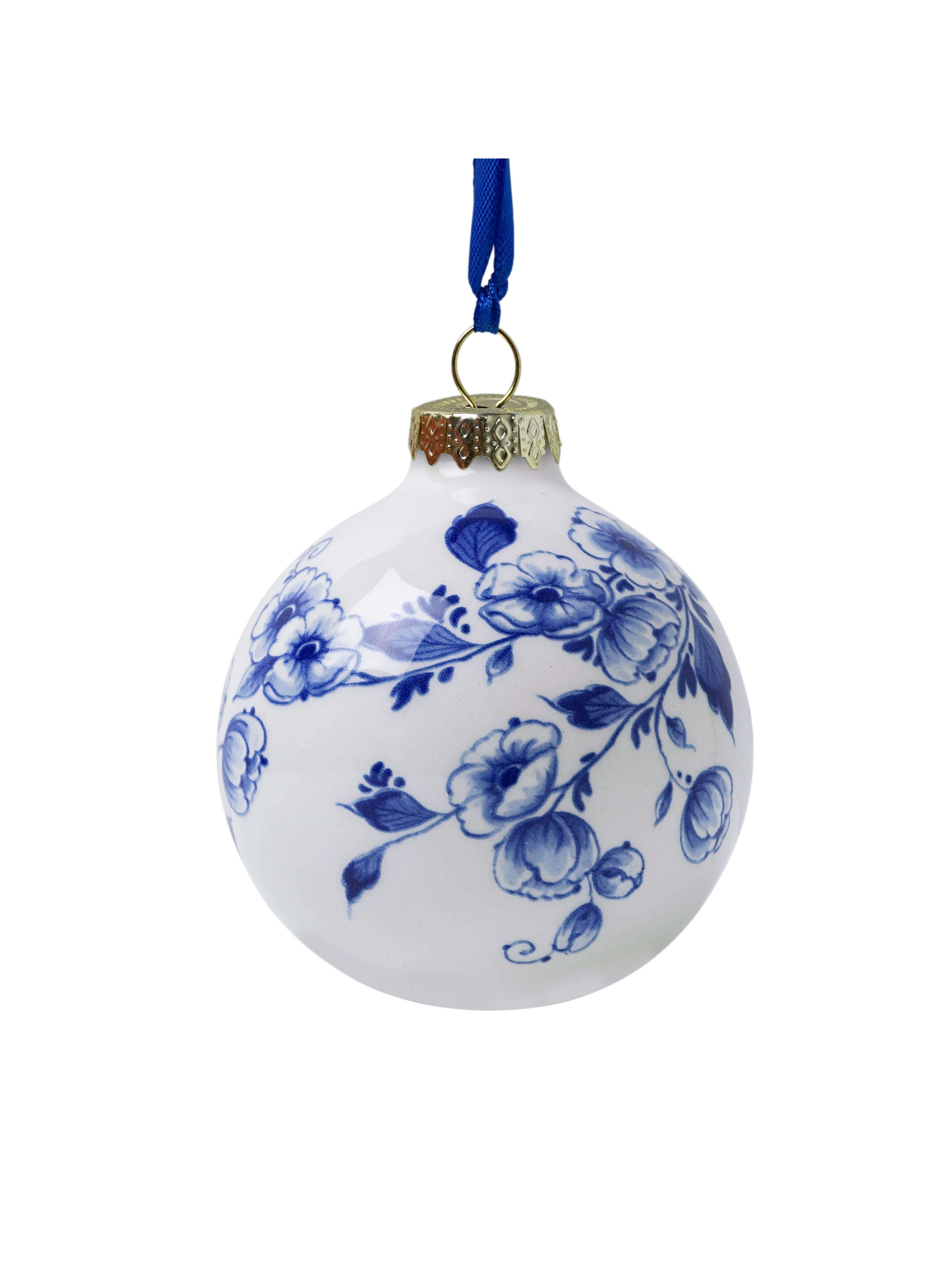Kerstbal Bloemen - Delfts blauw - Keramiek - 7 cm
